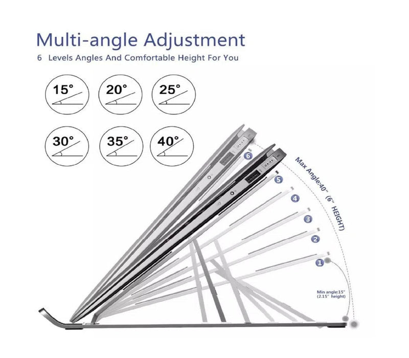 Soporte de ALUMINIO plegable para laptops de hasta 15.6''. El diseño pensado en la ergonomía le permite colocar hasta 6 niveles de altura a su laptop o tablet. Esto evitará que usted tenga mala postura al estar frente a la pantalla.